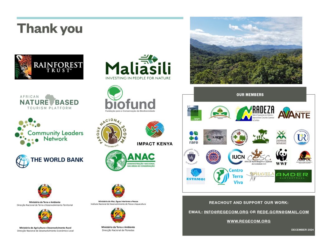 Maliasili, African Nature Based Tourism Platform, BIOFUND _ Administração Nacional das Áreas de Conservação Rainforest Trust , Mulago Umoja Wildlife Conservancies of Uganda , IUCN Eastern and Southern Africa